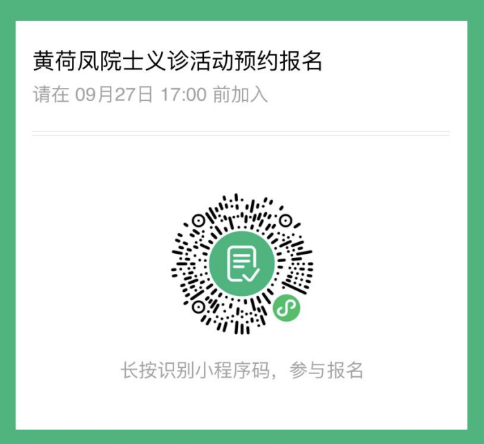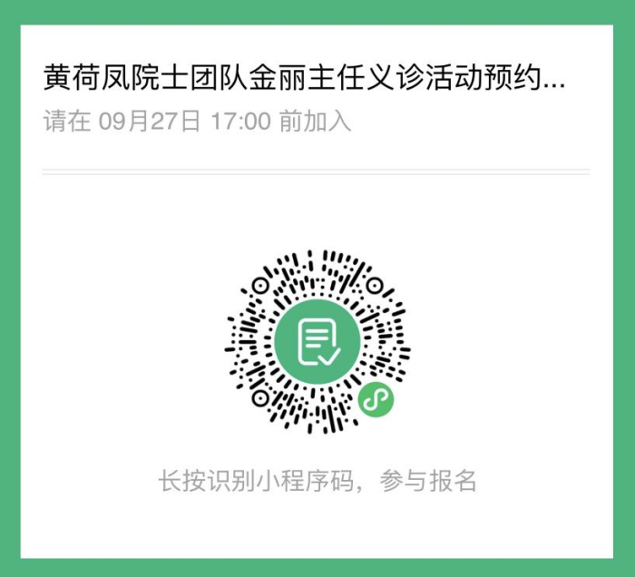 微信掃碼預(yù)約,限號30個,黃荷鳳院士10個號、金麗主任20個號,請掃碼預(yù)約時填寫個人準確信息,約滿為止。