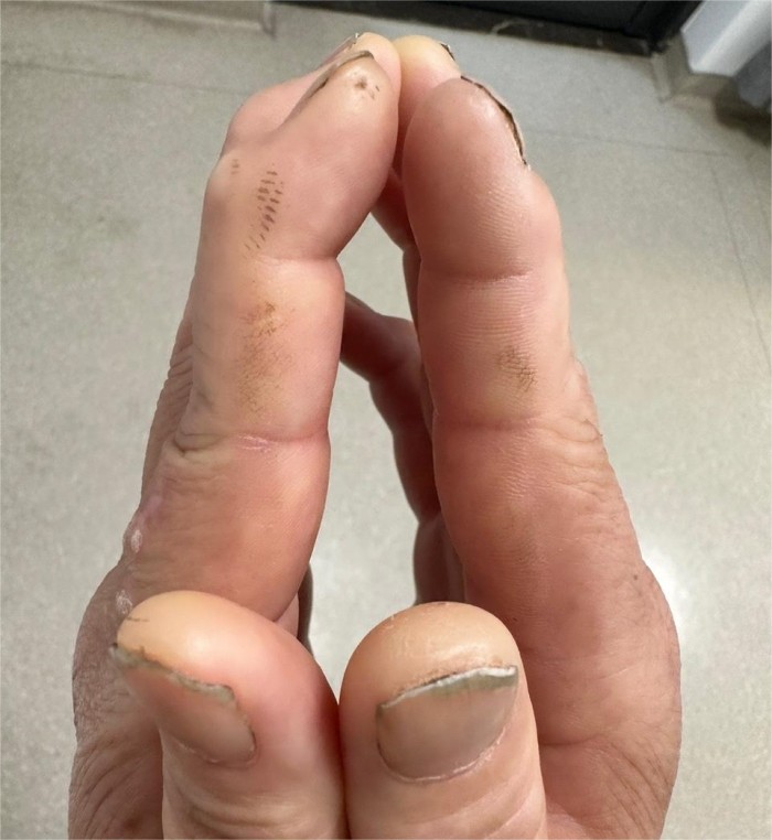 表現(xiàn)為手指的掌面和側(cè)面皮膚過多角化、裂紋及粗糙,類似于長期從事手工作業(yè)的技術(shù)工人手,故名“技工手”。還可出現(xiàn)足跟部的表皮增厚、粗糙和過度角化,又稱為“技工足”。