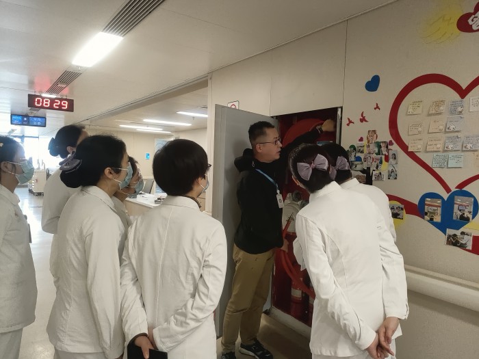 活動現(xiàn)場,消化內(nèi)科護士長舒俊英帶領(lǐng)科室人員聯(lián)合消控中心模擬面對火災(zāi)的不同情況展開不同的應(yīng)急措施,涉及火勢未控制、出現(xiàn)大量濃煙、需要疏散人員等不同情況。
