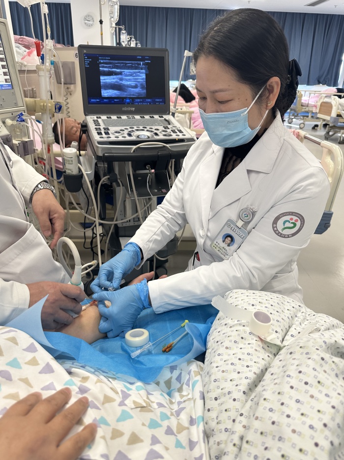 在醫(yī)生的配合下,血透中心護士長樊雪芳在彩超下為徐阿姨進行了透析用套管針進行穿刺,15分鐘后穿刺完成,用彈力繃帶固定妥善后,5天后隧道建成,透析用套管留置針順利拔出,立即可以使用鈍針扣眼穿刺后透析。