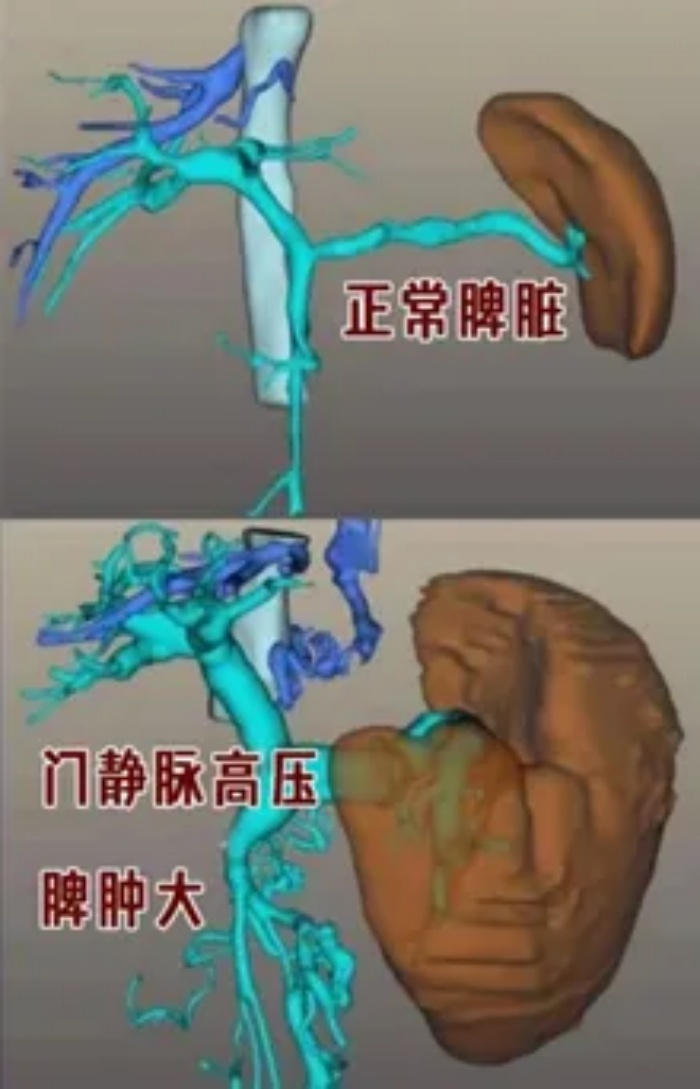 其中,脾臟腫大最常見的原因是淤血,而導(dǎo)致脾淤血最常見的原因就是肝硬化門靜脈高壓。