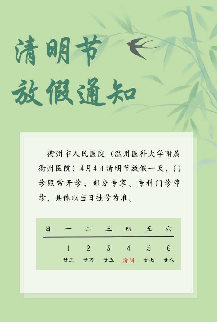 衢州市人民醫(yī)院2024年清明節(jié)門診安排 文章來源:門診部 作者: 點擊數(shù):1917 更新時間:2024-04-01 上一篇: 我院2024年清明節(jié)門診安排 下一篇: 歡度六一,童趣飛揚(yáng)
