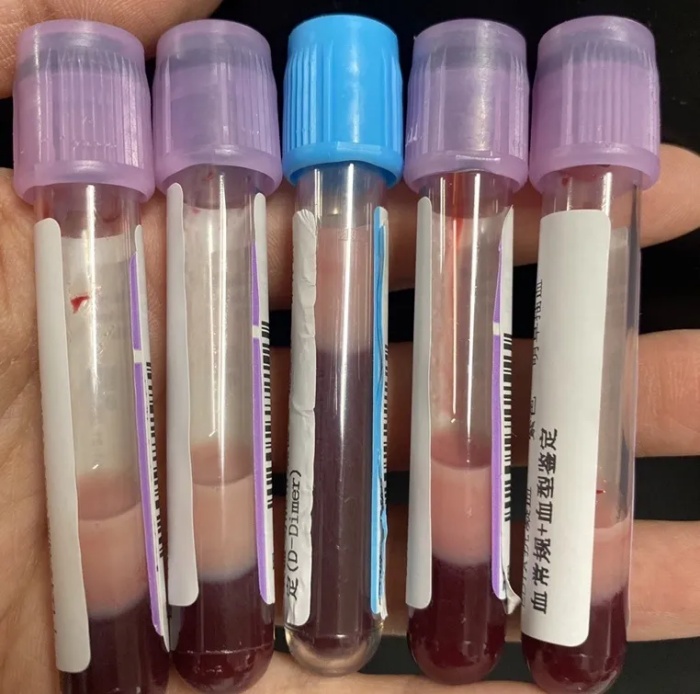 當(dāng)護士為她抽血做進一步檢測時,發(fā)現(xiàn)抽出來的血并不是鮮紅色,而像摻了牛奶一樣,變成粉色。