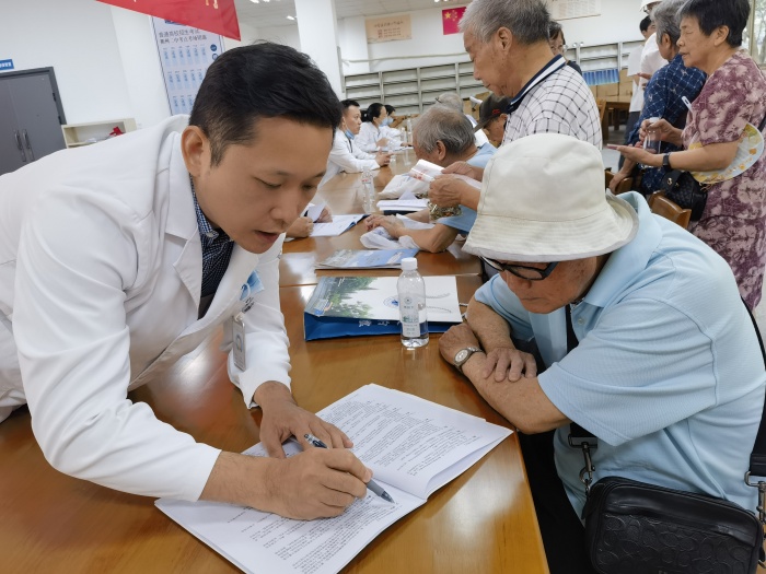 來自心血管內(nèi)科、肝膽外科、康復(fù)醫(yī)學(xué)科等多個(gè)科室的30名醫(yī)務(wù)人員,現(xiàn)場為老師把脈問診,并提供推拿、理療、測血壓等醫(yī)療服務(wù),一對(duì)一開展健康宣教,提出專業(yè)建議。
