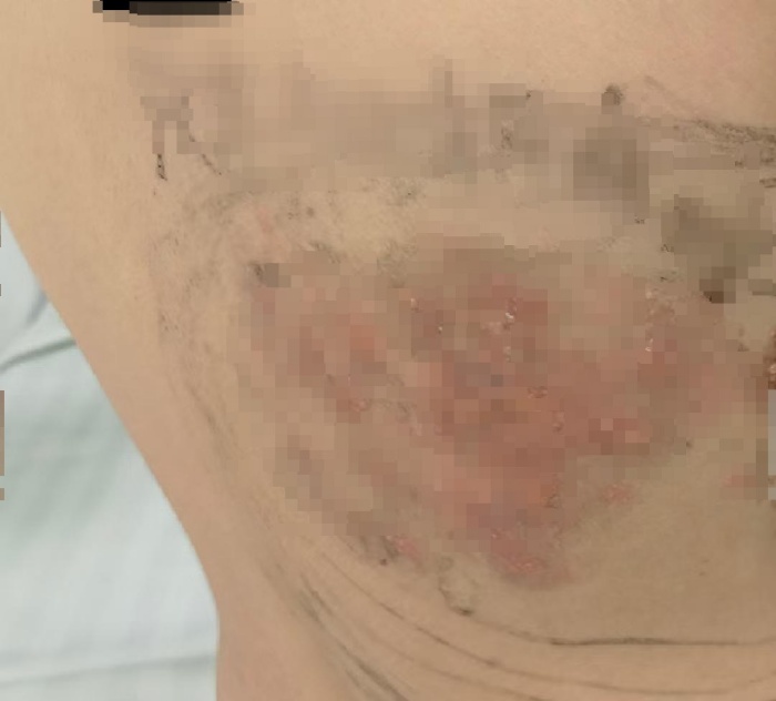 楊醫(yī)生采用針灸圍刺瀉法,以清肝利濕解毒止痛,同時用梅花針叩刺放血清除肌膚瘀積的瘀毒,用火針加速瘀毒消散。
