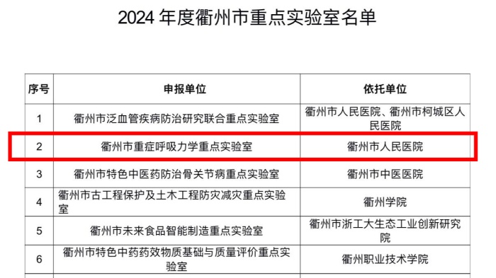 近日,衢州市科技局公布了2024年重點(diǎn)實(shí)驗(yàn)室項(xiàng)目名單,由我院重癥醫(yī)學(xué)科張偉文主任醫(yī)師及王丹瓊副主任醫(yī)師牽頭申報(bào)的“衢州市重癥呼吸力學(xué)重點(diǎn)實(shí)驗(yàn)室”成功獲批,該實(shí)驗(yàn)室也是衢州首個(gè)重癥呼吸力學(xué)實(shí)驗(yàn)室。