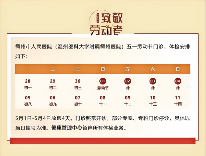 衢州市人民醫(yī)院2025年勞動節(jié)門診安排 文章來源:門診部 作者: 點擊數(shù):1114 更新時間:2025-04-23 上一篇: 4月19日,溫醫(yī)大附二院育英兒童醫(yī)院專家林進(jìn)漢來院坐診 下一篇: 我院浮石院區(qū)康復(fù)理療科新開設(shè)頸肩腰腿痛門診