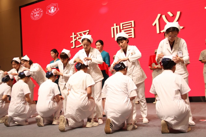 活動(dòng)現(xiàn)場(chǎng),溫州醫(yī)科大學(xué)護(hù)理學(xué)院見(jiàn)習(xí)生授帽儀式舉行,將護(hù)理事業(yè)的使命與責(zé)任代代相傳。護(hù)理前輩李衛(wèi)華老師分享從醫(yī)感悟,青年護(hù)士手捧鮮花致敬傳承。